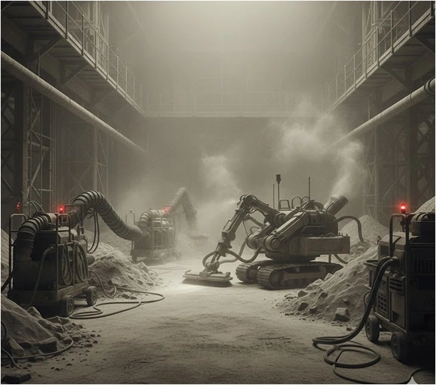 Cutting, scraping, and blasting generate intense dust.